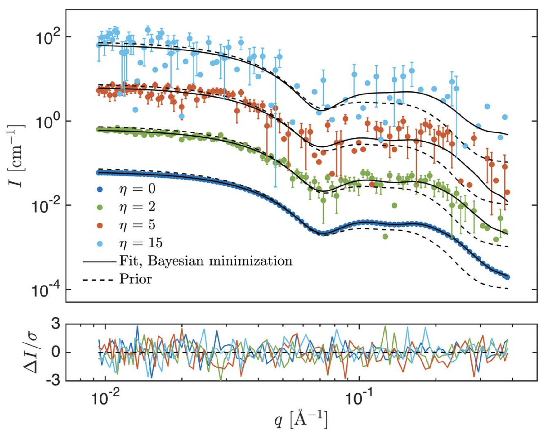 BayesFit fits SAXS or SANS data (or a combination) with form factor and structure factors. Bayesian regularization is applied