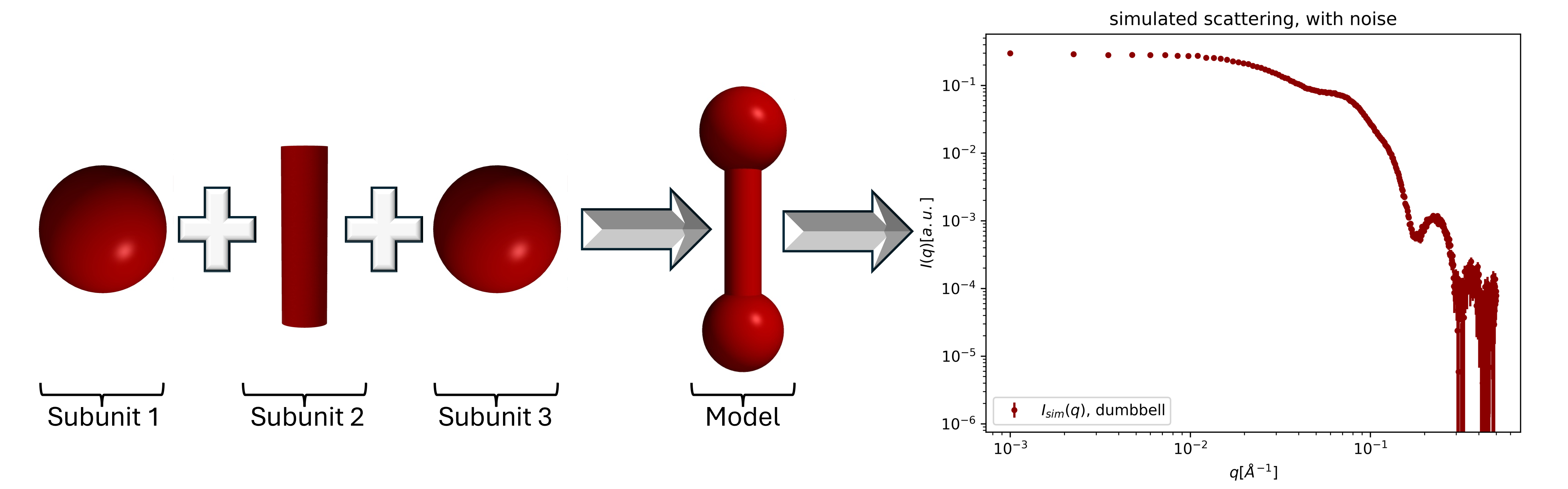 Shape2SAS simulates small-angle x-ray scattering (SAXS) from user-defined shapes. The models are build from geometrical subunits, e.g., a dumbbell constructed from a cylinder and two translated spheres. The shape is filled with points and the scattering is calculated by a Debye sum.